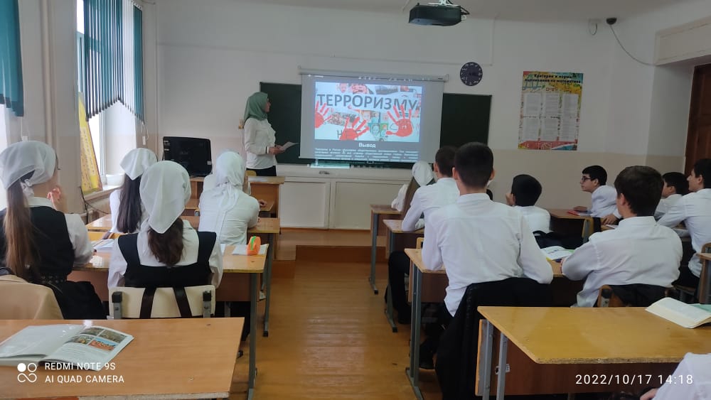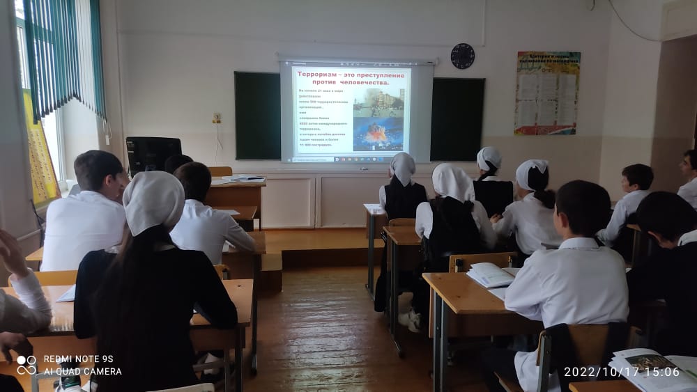 Руководитель ОБЖ МБОУ «Энгель – Юртовская СШ №1 им.Осмаева У.Г.» Абдуллаева Хеди Камалдиновна провела патриотическое мероприятие «Терроризм не пройдет» посвящённое борьбе с идеологией терроризма павших героев отдавших свои жизни спасая детейс учащимися 7-8 классов