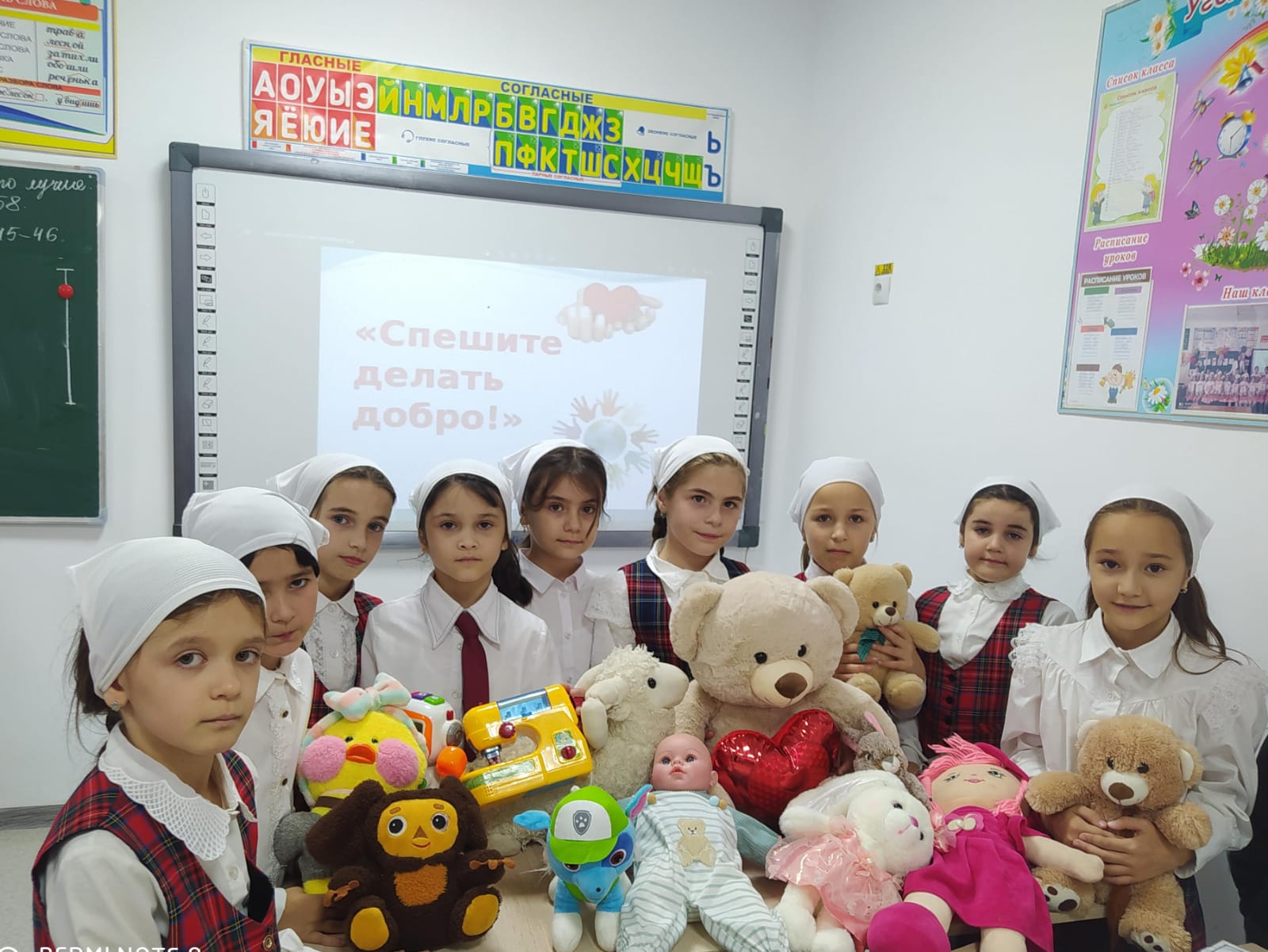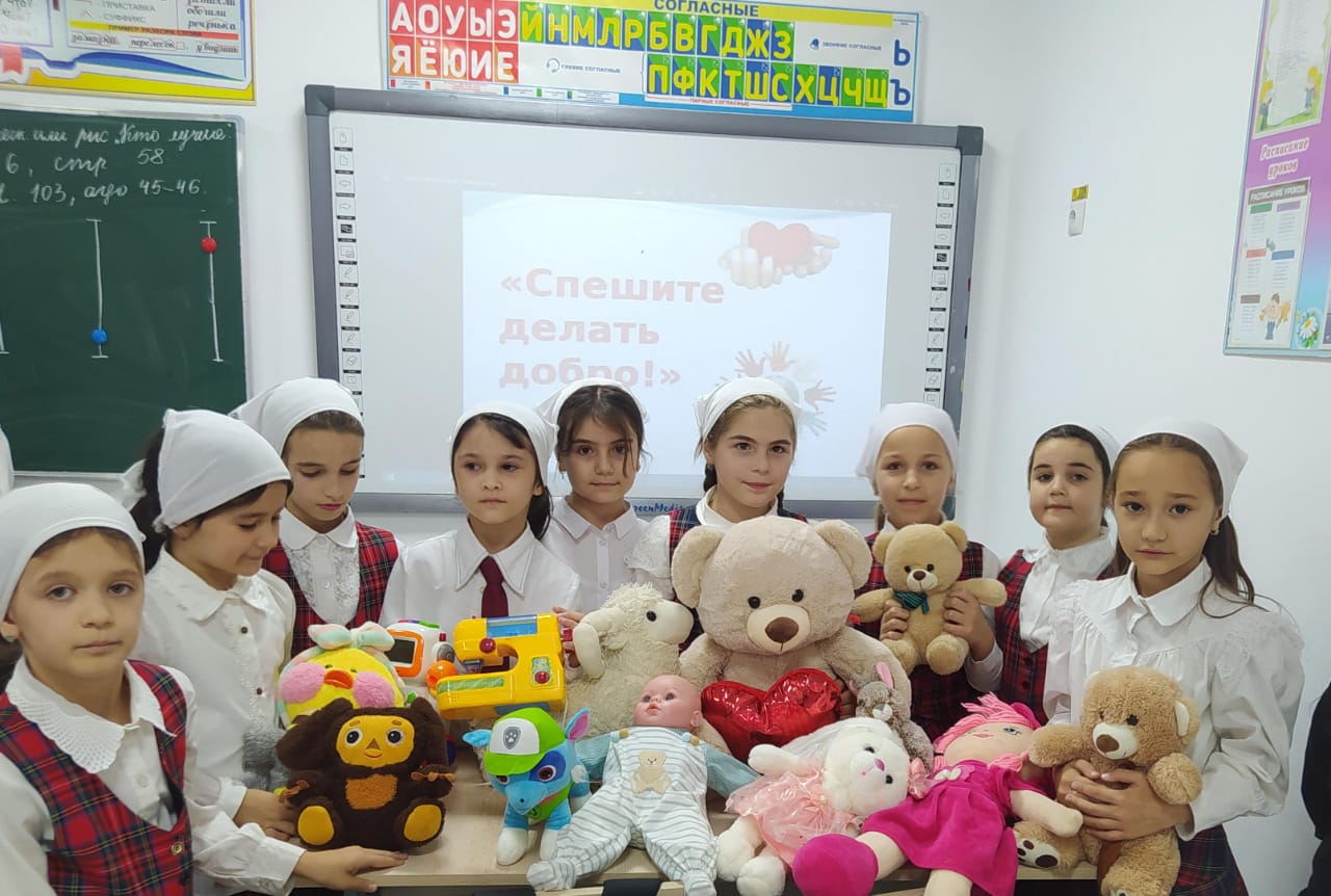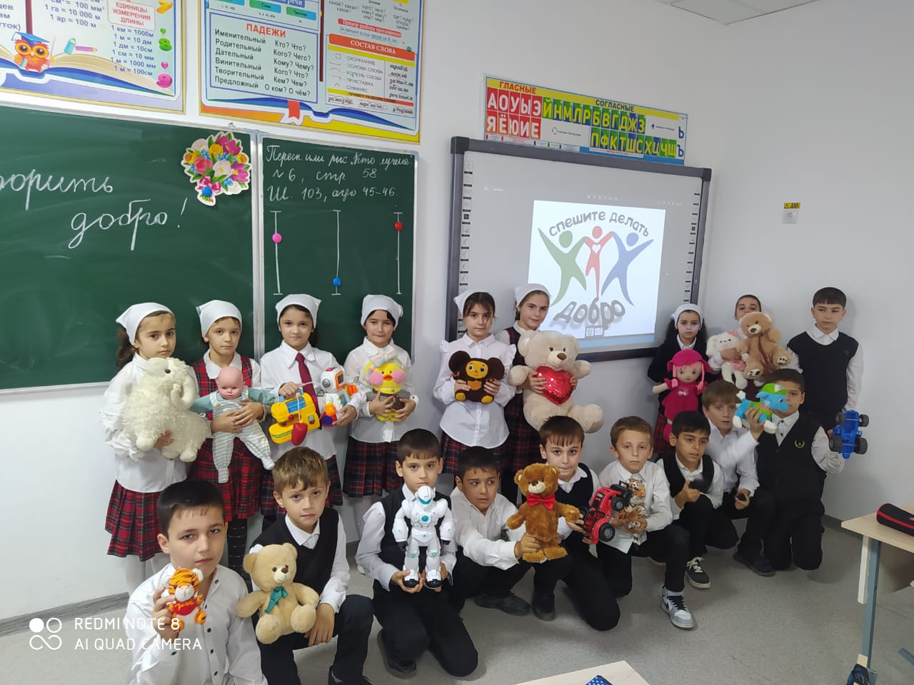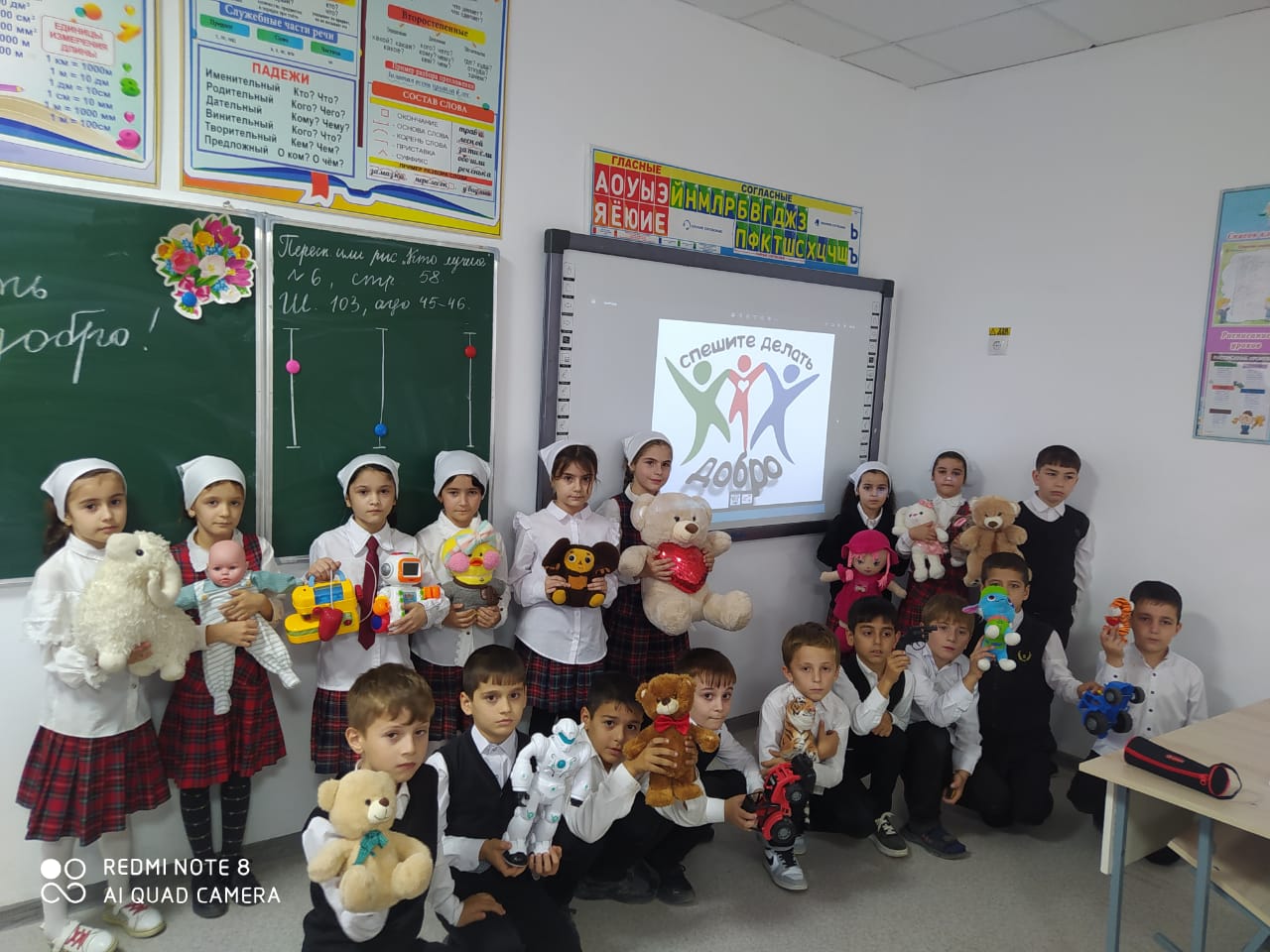 15.11.202314 ноября 2023г. по инициативе советника директора по воспитанию Селимсултановой П.Б. учительница начальных классов МБОУ "Энгель-Юртовская СШ1 имени Осмаева У.Г." Шабазова Зайнап Жамирзаевна провела урок Доброты "Спеши делать добро" с целью закрепить и углубить знания учащихся о вежливости, о культуре поведения, о добром отношении к окружающим людям.В конце мероприятия дети решили подарить свои игрушки детям инвалидам.Если доброта,как солнце,светит, радуются взрослые и дети.Добро,которое мы делаем бескорыстно, не пропадет.Оно нужно всем нам.Спешите же делать добро!