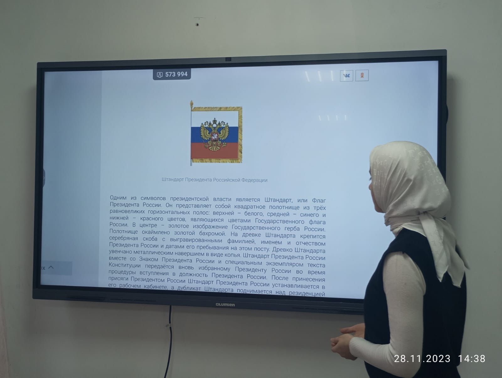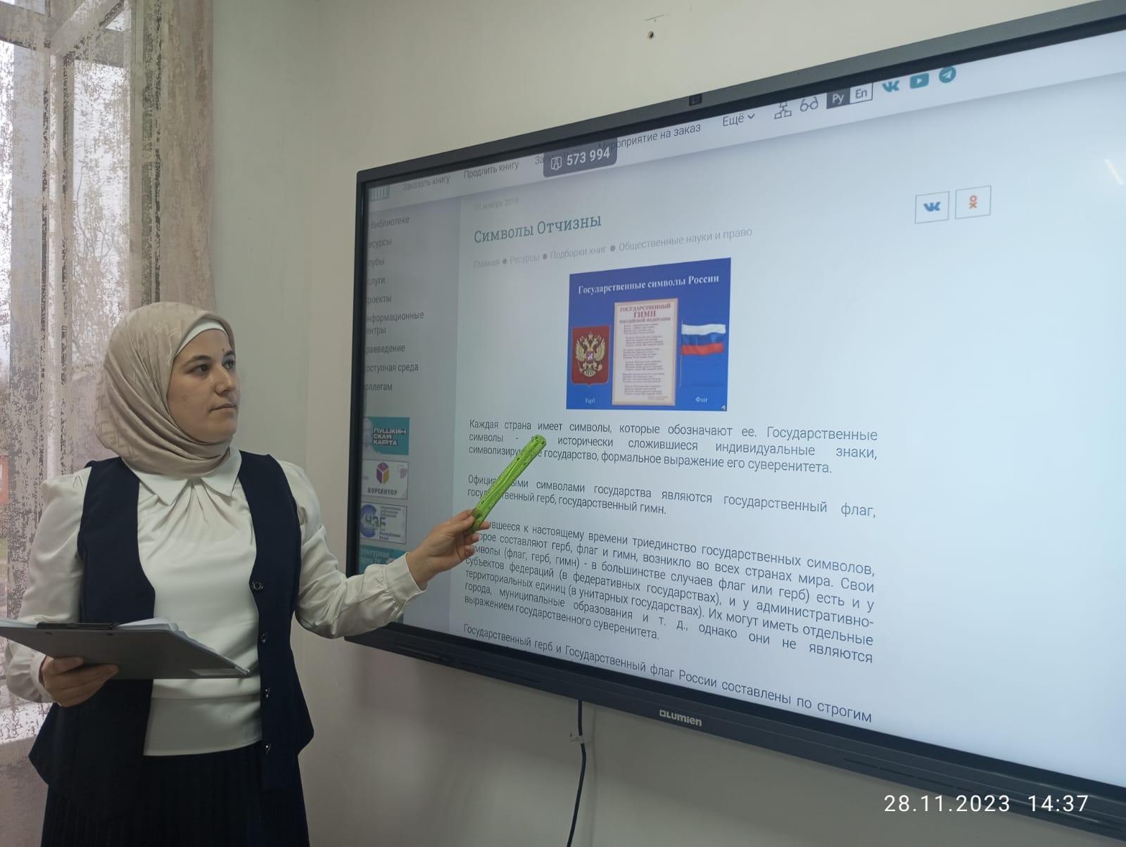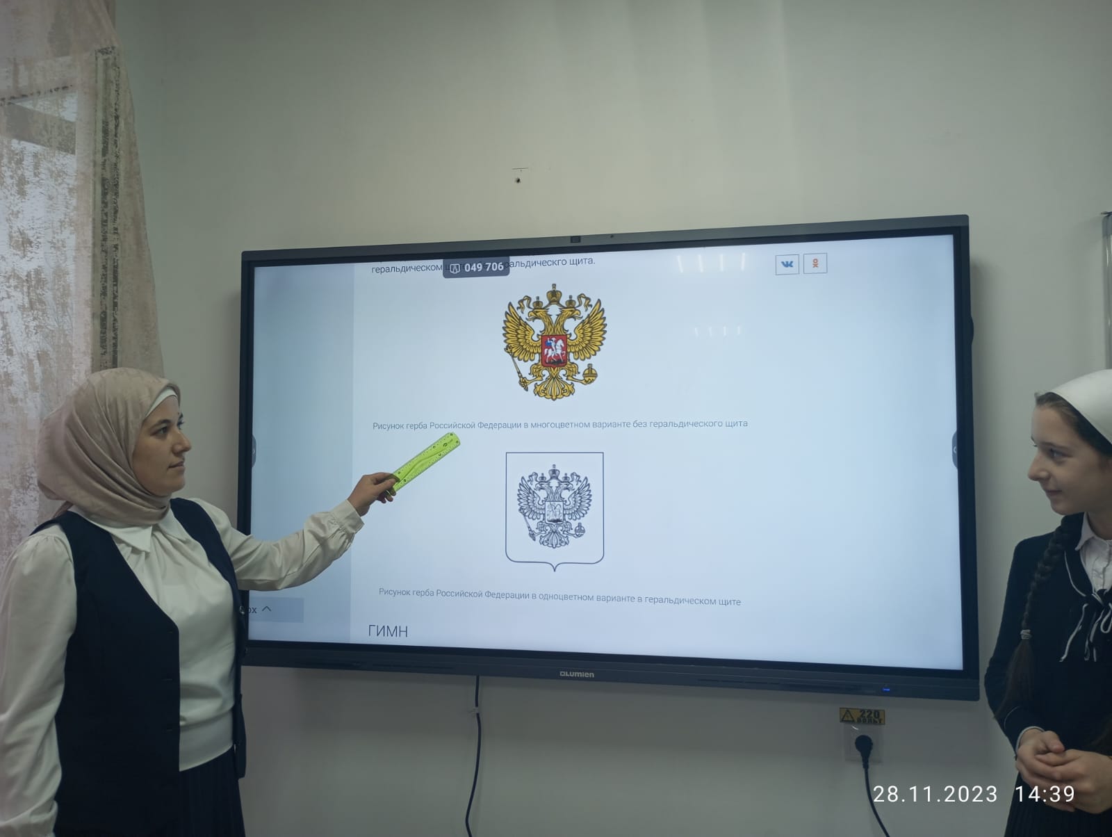 30.11.202330 ноября 2023г в МБОУ" Энгель-Юртовская СШ1 имени Осмаева У.Г." учительница истории и обществознания Дууева Малика Сайд-Ахмедовна провела классный час, посвященный к Дню Государственного герба РФ.Главной целью которой было: ознакомление учащихся с историей создания герба, смысловыми значениями символов герба, воспитать уважение к историческому прошлому России.