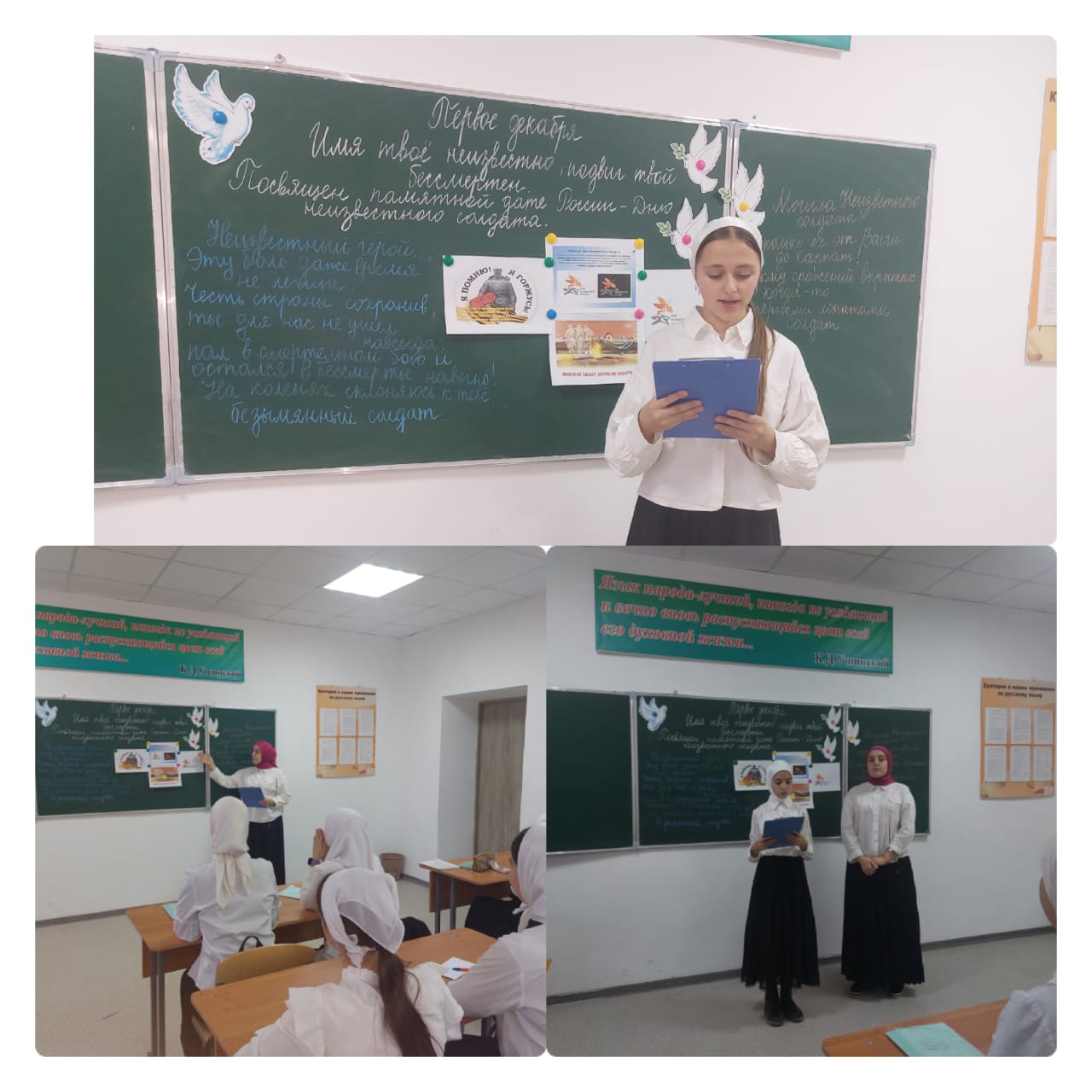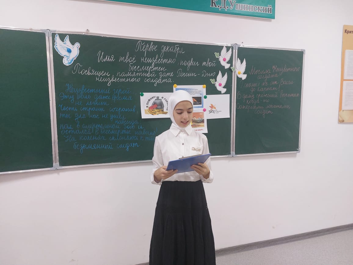 1 декабря 2023г. в МБОУ "Энгель-Юртовская СШ1 имени Осмаева У.Г." учительница русского языка и литературы Юнусова А.Р. провела открытый классный час "Имя твоё неизвестно, подвиг твой бессмертен", посвященный ко Дню неизвестного солдата.