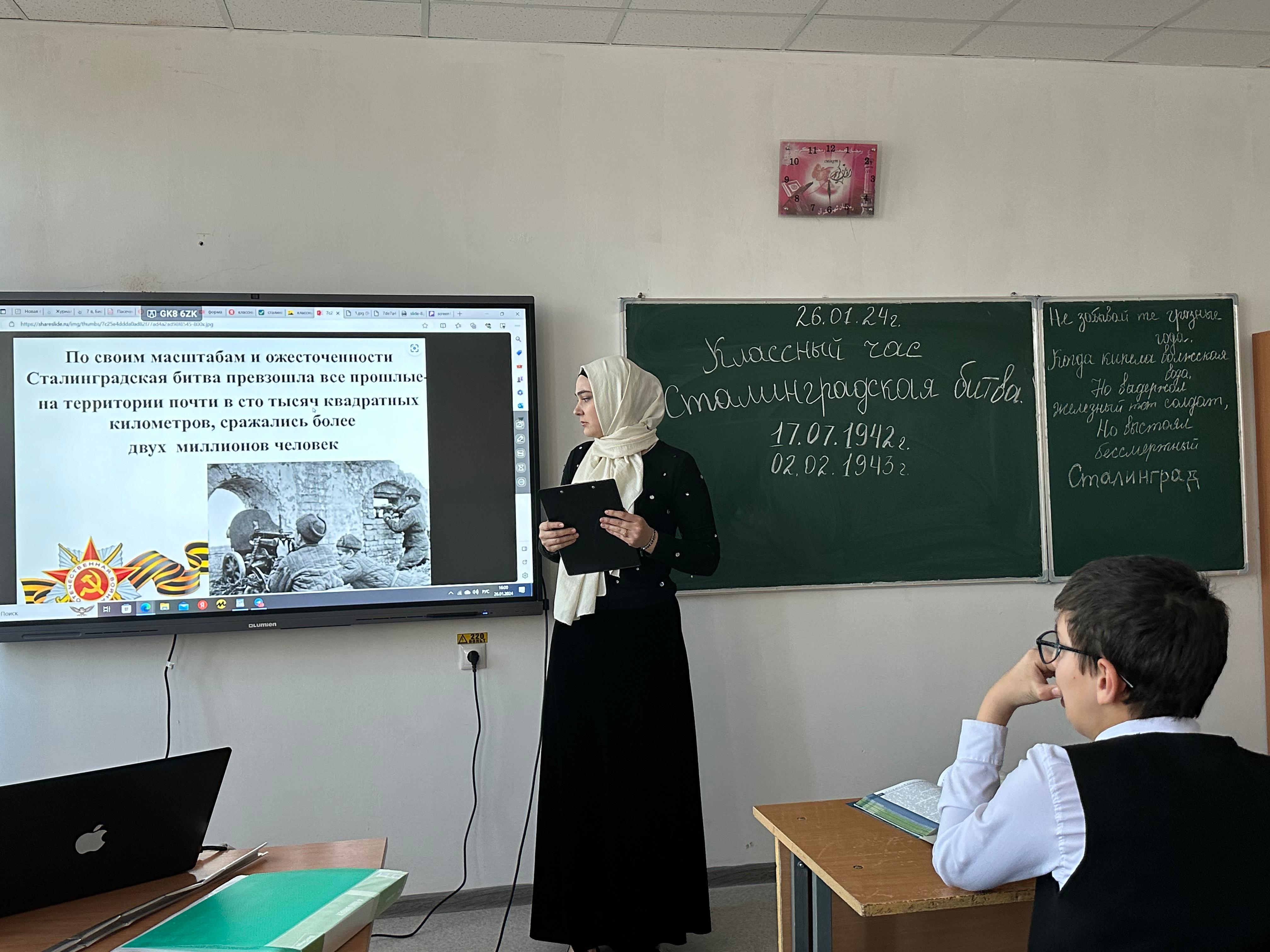27.01.202427 января 2024 г. в МБОУ "Энгель-Юртовская СШ1 имени Осмаева У.Г." прошли классные часы, посвященные ко Дню разгрома советскими войсками немецко-фашистских войск в Сталинградской битве.Классные часы провели учителя старших классов Махтиева Л.А. и Абуева А.А.Советник директора по воспитанию Селимсултанова Петимат Боршиковна провела беседу о важности Сталинградской битвы.Она отметила,что Сталинградская битва- одно из важнейших генеральных сражений Второй мировой и Великой Отечественной войны между Красной армией и вермахтом при поддержке армий стран"оси",закончившееся победой РККА.