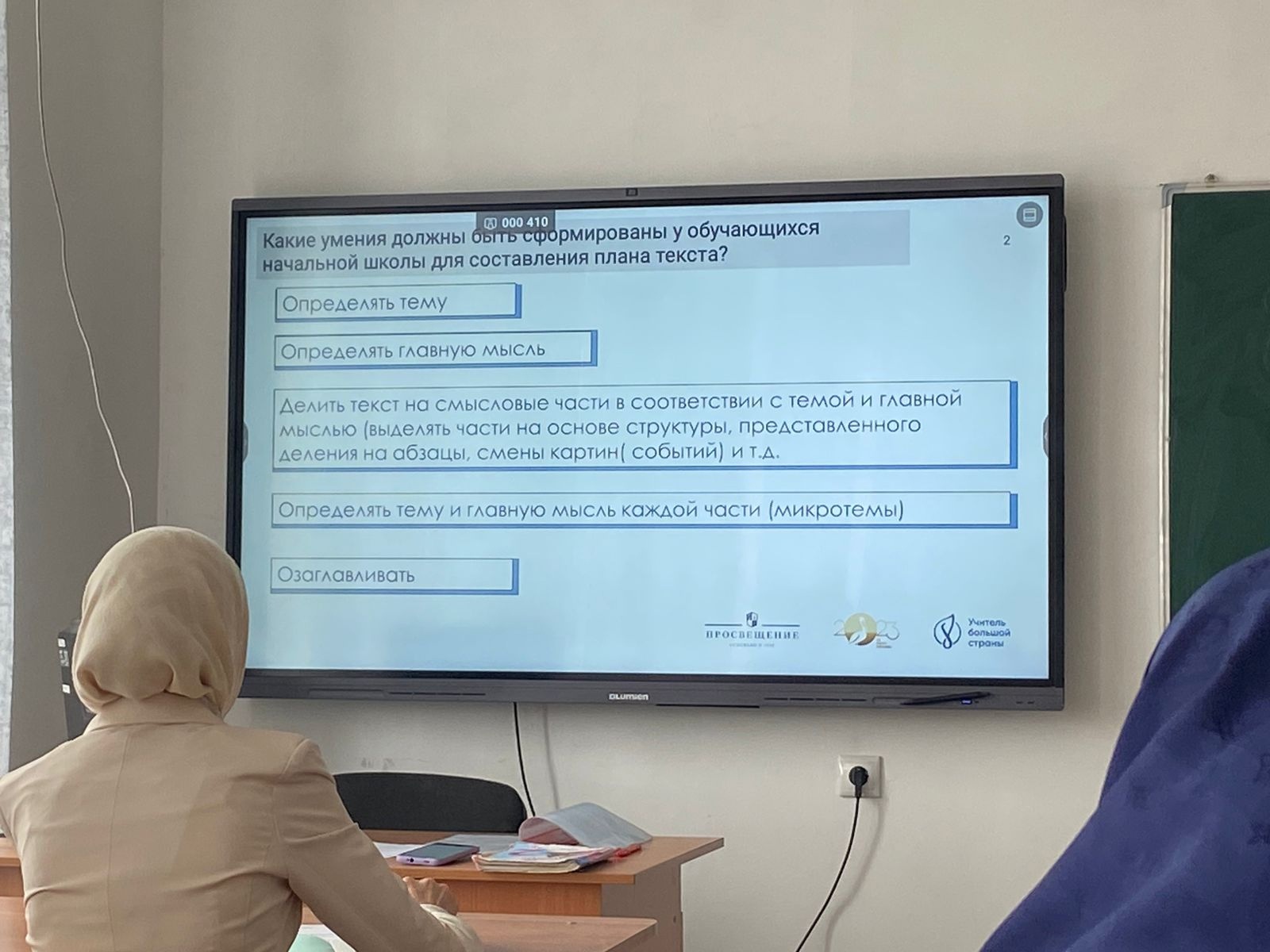 18.03.202418.03.2024г. в МБОУ «Энгель-Юртовская СШ№1 им.Осмаева У.Г. » Сайпуллаевой Малкан Рамзановной , учителем начальных классов , был проведен обучающий семинар с учителями начальных классов на тему: «Формирование умений составлять план текста у обучающихся младшего школьного возраста».На семинаре присутствовали учителя начальных классов.