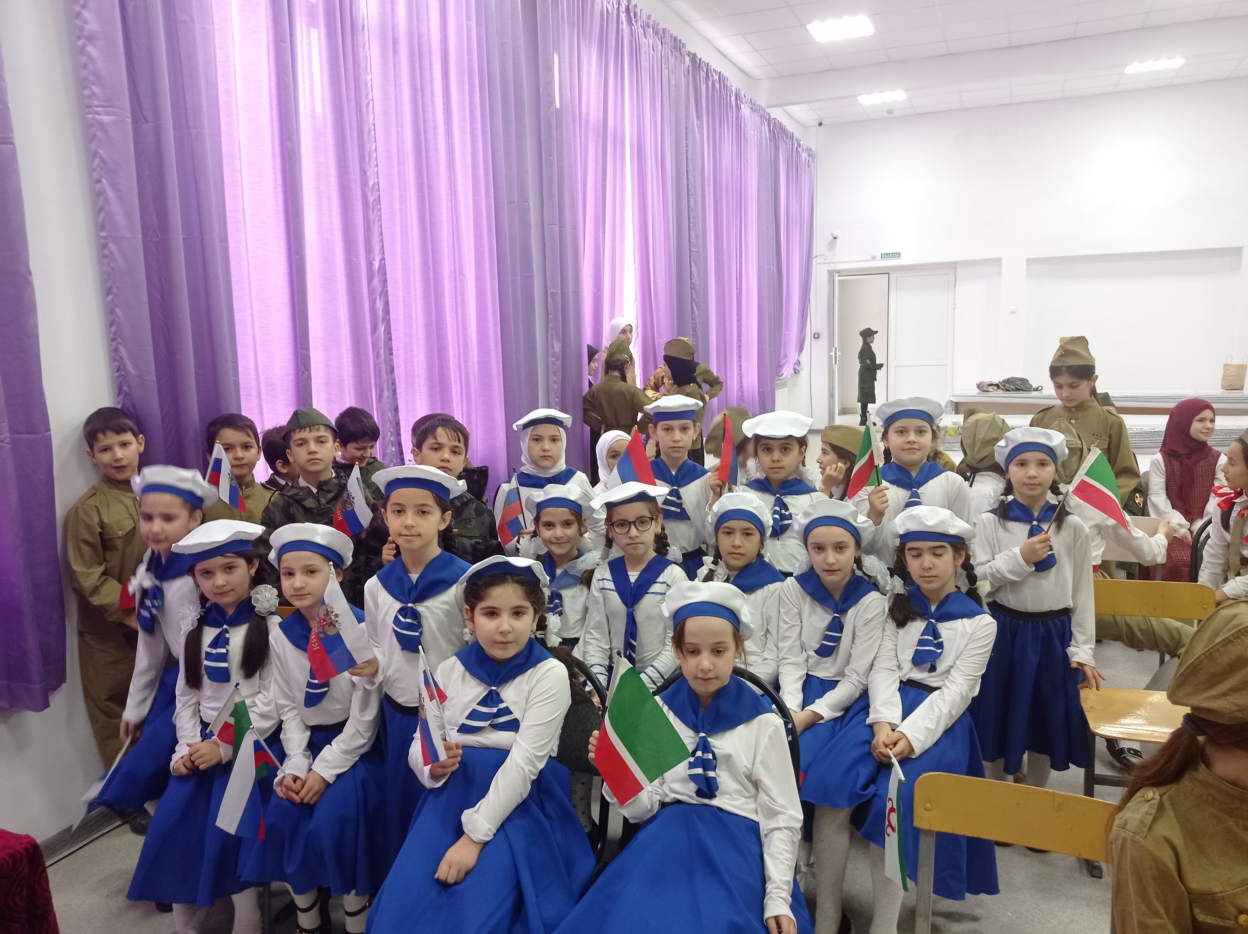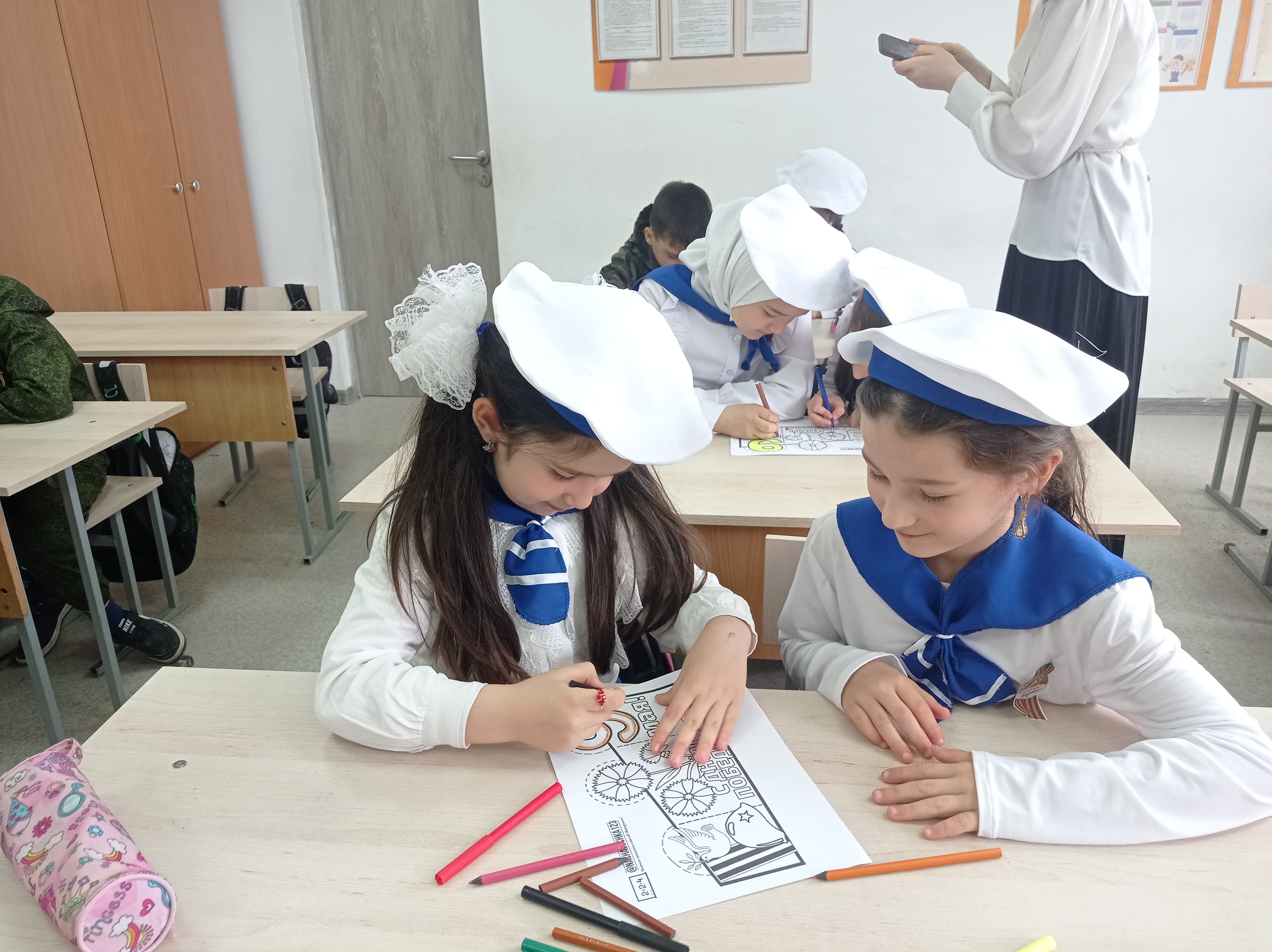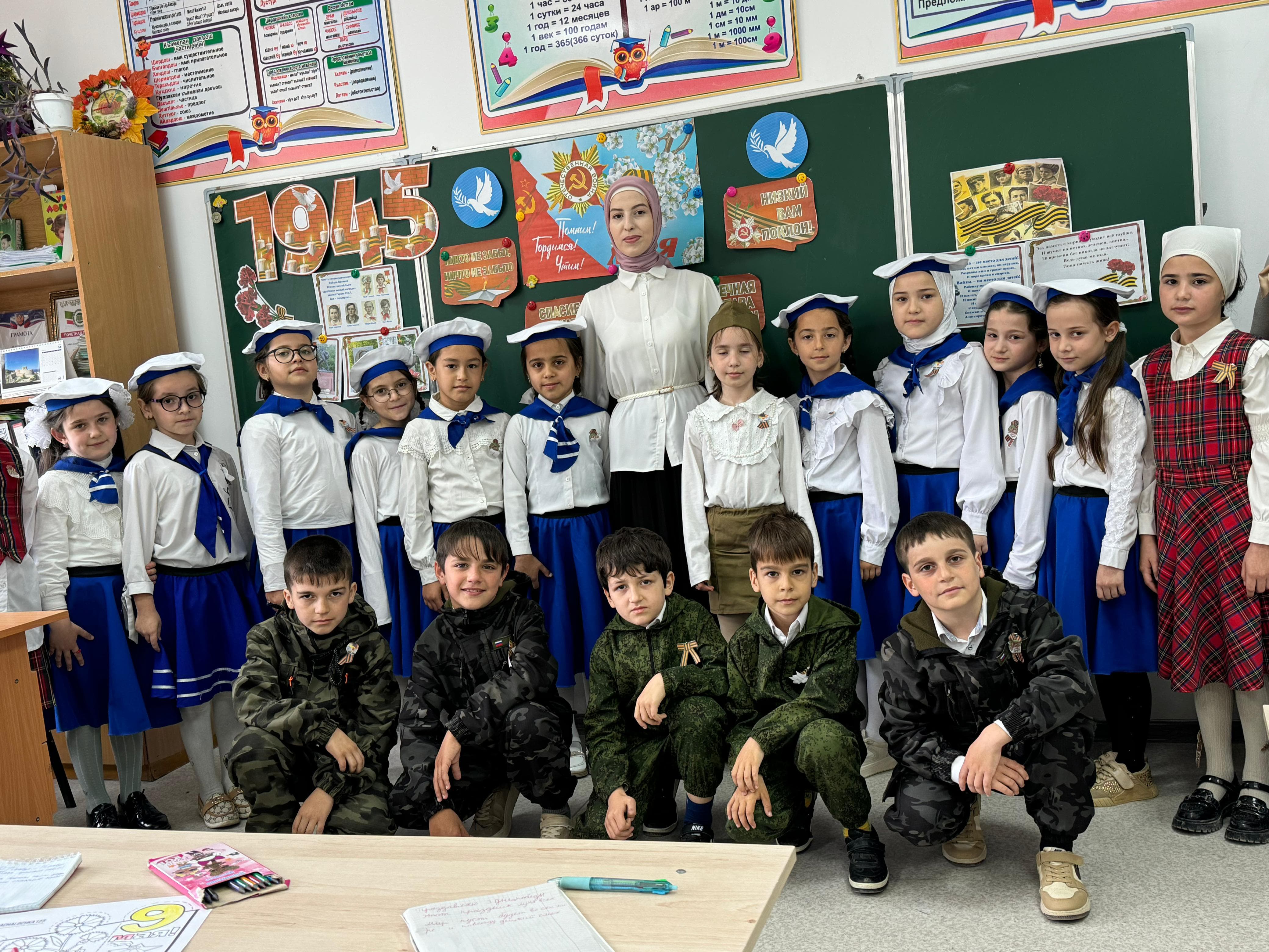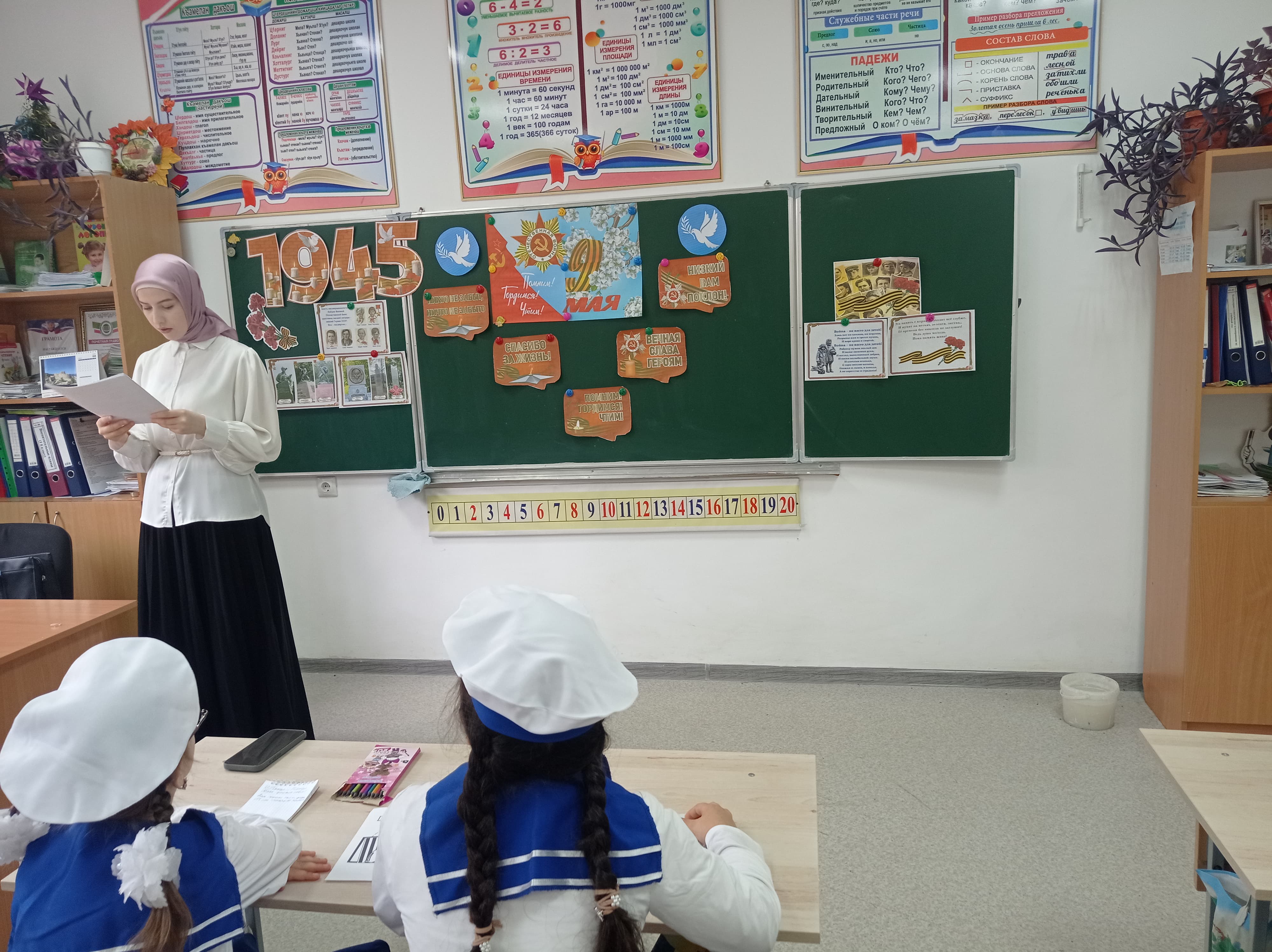 Классные руководители начальных классов Абдулкадырова З.И.,Нухаева З.С.,Бутуева Р.И.,Дудуева Т.Х. провели классные часы, посвященные этой дате. Этот день можно считать датой не только окончания войны, но и начала совершенно нового периода в мировой истории – периода противостояния двух идеологических и экономических систем, которого мир не знал прежде и которого не могло быть без Второй мировой войны. Моряки американского линкора «Миссури» (USS Missouri (BB-63) наблюдают за началом церемонии капитуляции Японии, проводившейся на палубе линкора. На этом корабле официально закончилась Вторая мировая война.
