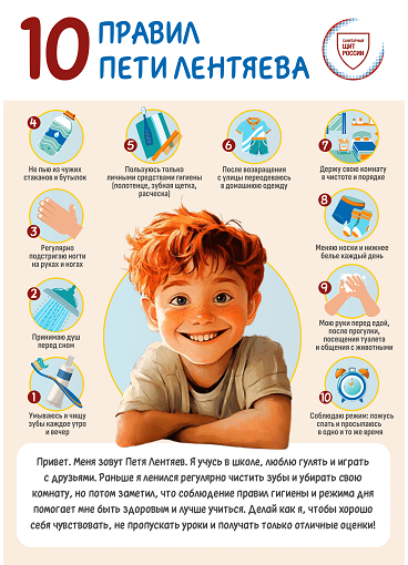 Так появился Петя Лентяев - веселый школьник, задорный мальчишка, который раньше ленился, но потом понял, что соблюдение простых правил гигиены, правильное питание и здоровый образ жизни помогают лучше себя чувствовать и хорошо учиться.