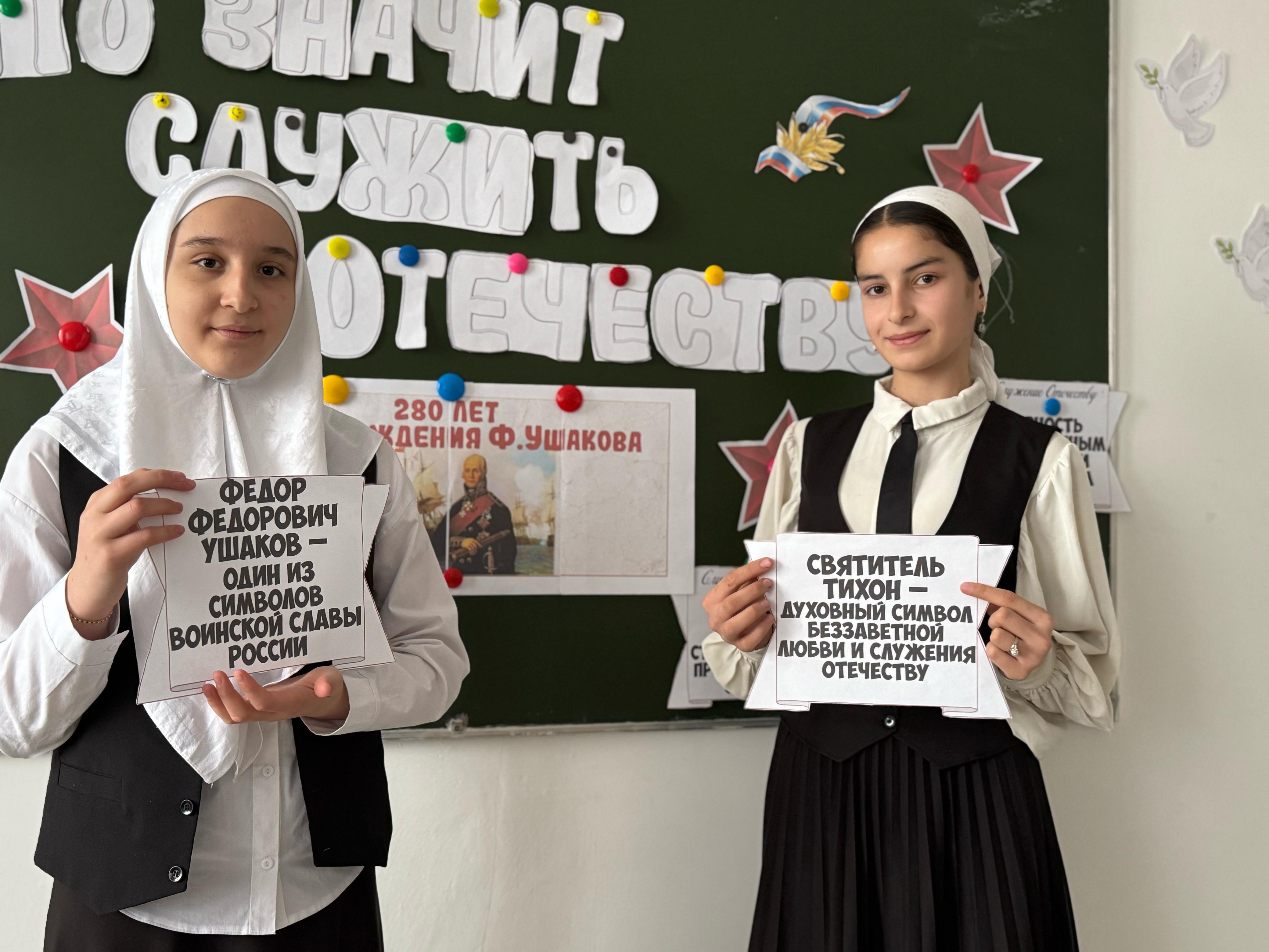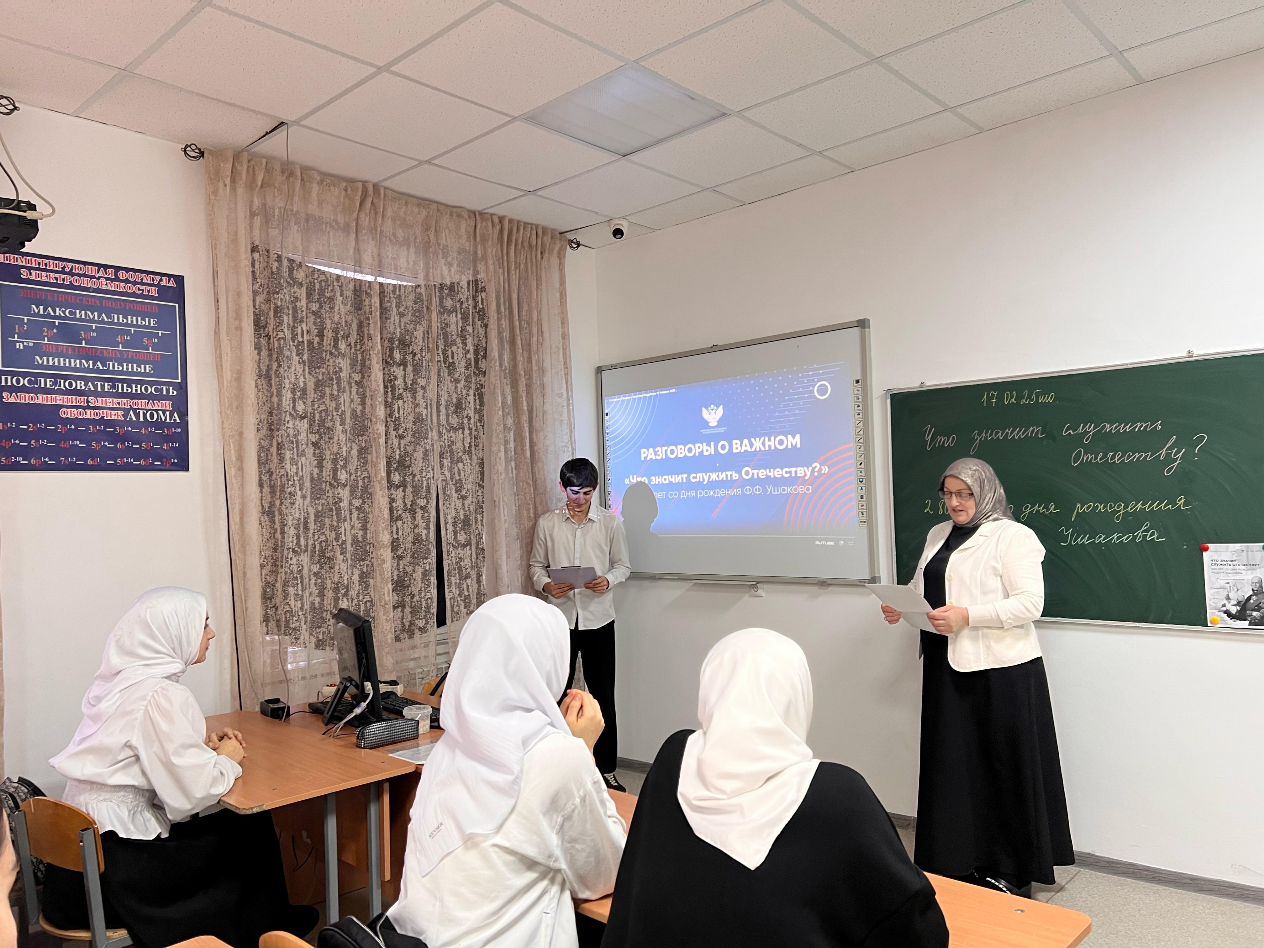 17 февраля 2025 года в МБОУ «Энгель-Юртовская СШ№1 им.Осмаева У.Г.» было проведено занятие "Разговоры о важном" на тему “Что значит служить Отечеству? 280 лет со дня рождения Ф. Ушакова”